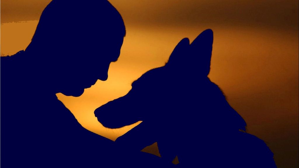 The dog was walking about 3 steps behind a man that looked bent. Briefly the dog look at my father with lightened eyes, but then continued walking.