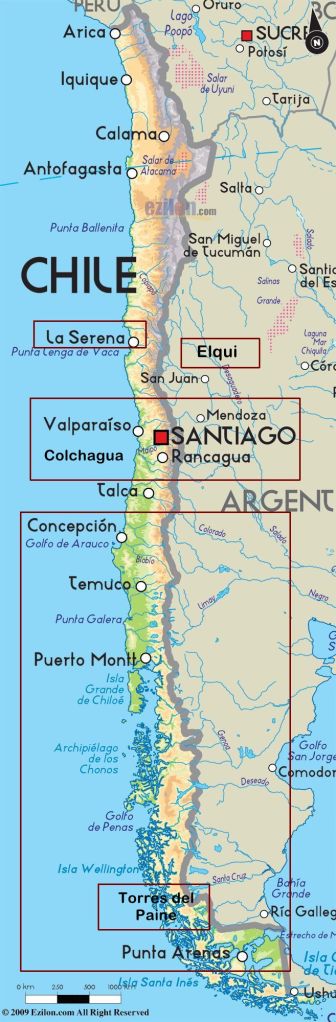 There are 3 distinct areas in Chile: The South including Patagonia, the canals and archipelagos of the fiords region, and the lakes and volcanos that make the region so famous; the central area which is the fertile agricultural area with its multitude of vineyards, orchards and vast kinds of produce and grains. This area also contains the major city Santiago, Chile’s capital, with a third of the country’s seventeen million population in 2008.